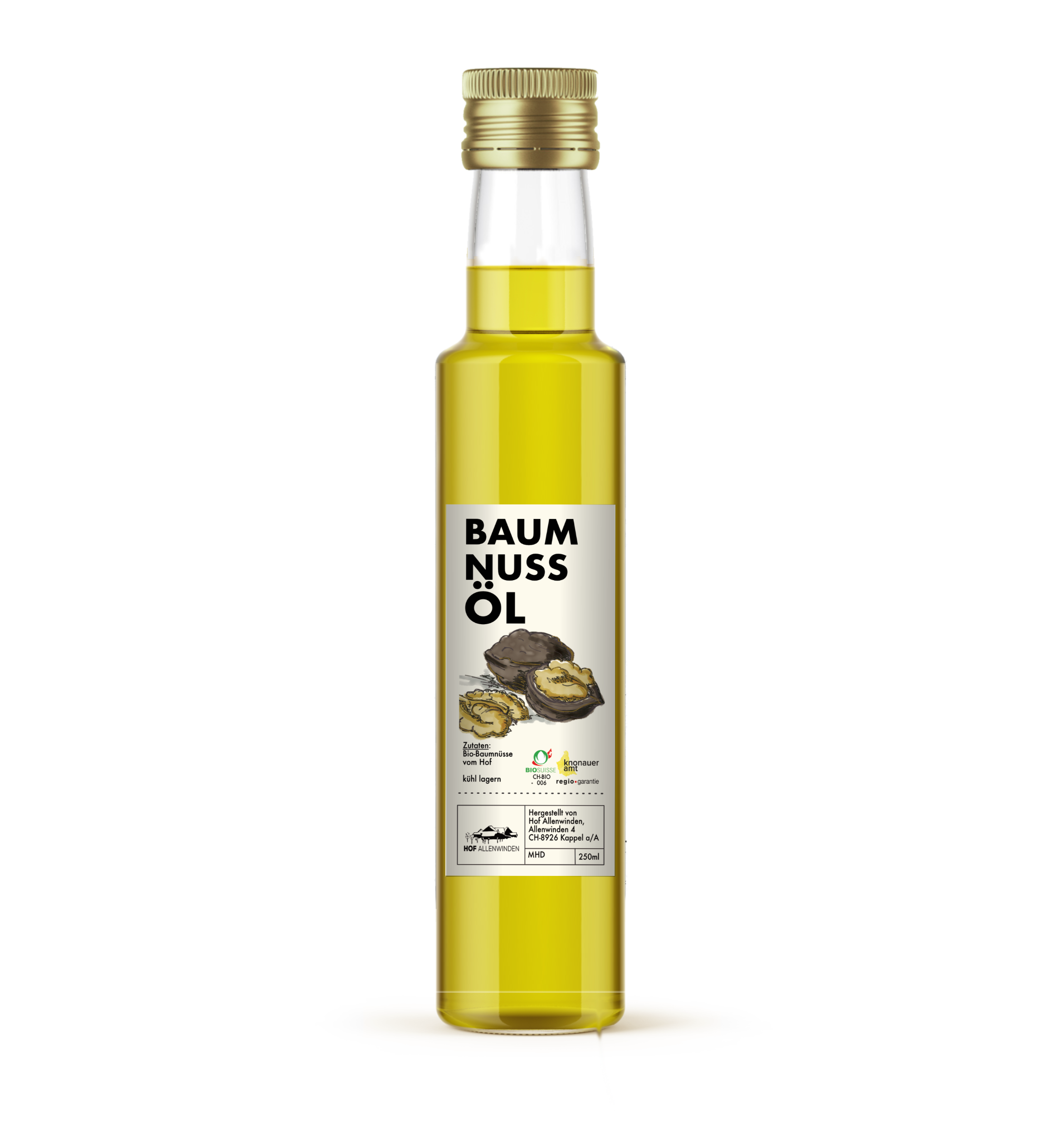 Dieses Baumnussöl wurde aus ganzen Nüsse vom Hof Allenwinden kaltgepresst. Im Kühlschrank kann man dieses Öl ein Jahr lang aufbewahren.